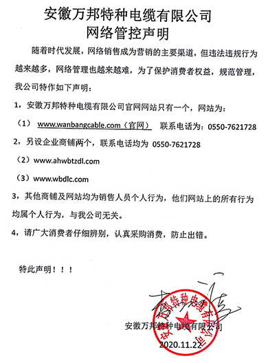 鄭重聲明:安徽萬邦特種電纜有限公司官方網站為:www_wanbangcable_com.gyxqd.com.cn,除此之外無任何子網站或合作網站,其余均為假冒偽劣。電話:0550-7621728 13485756353 地 址:安徽省天長市滁州高新技術產業開發區經四路29號